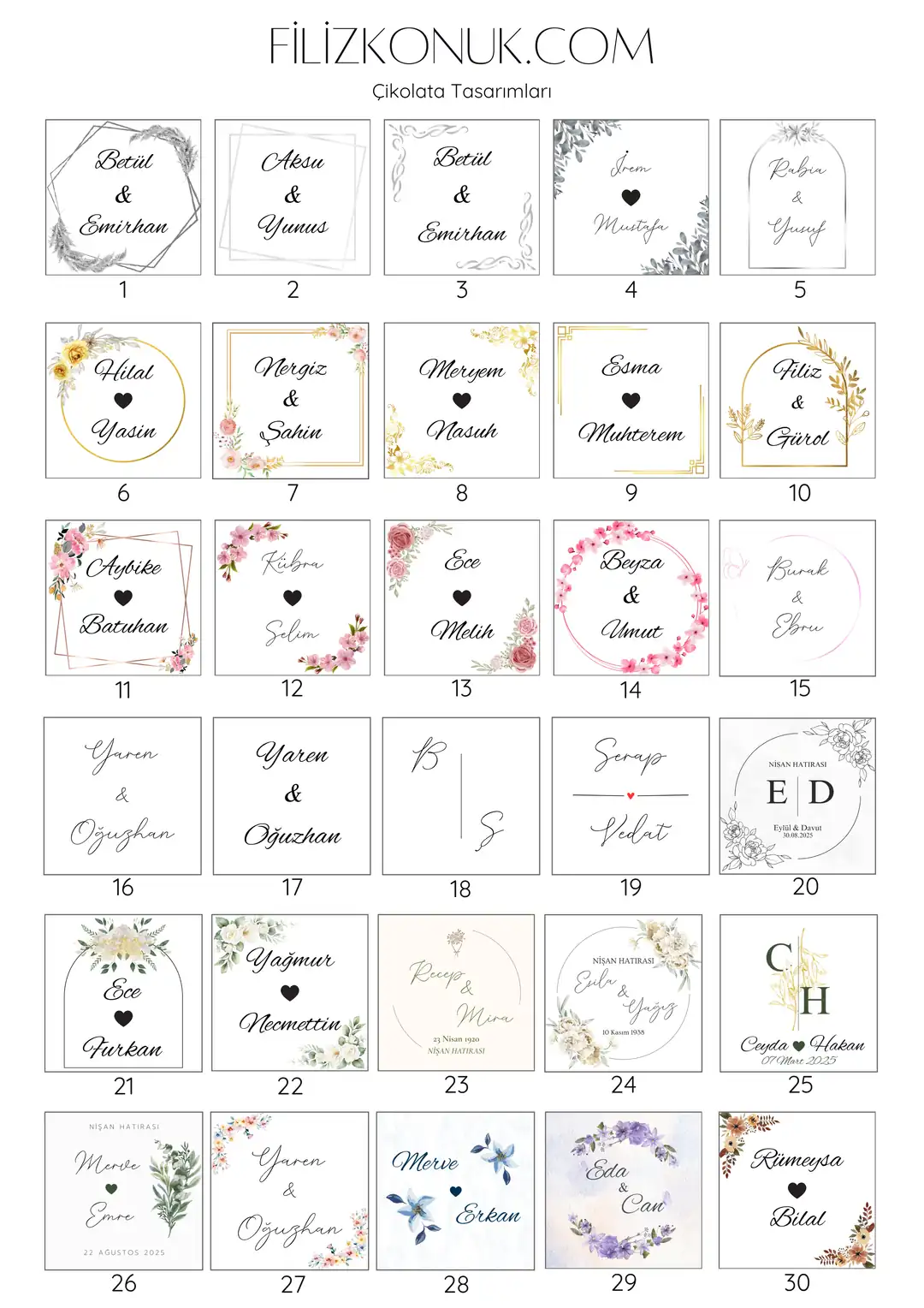 Kişiselleştirme: Çikolata kutusu üzerine parlak gümüş veya gold renk folyo ile gelin&damat ismi ve tarih yazabiliriz. İsterseniz isimlerin altına tarih ekleyebiliriz.
